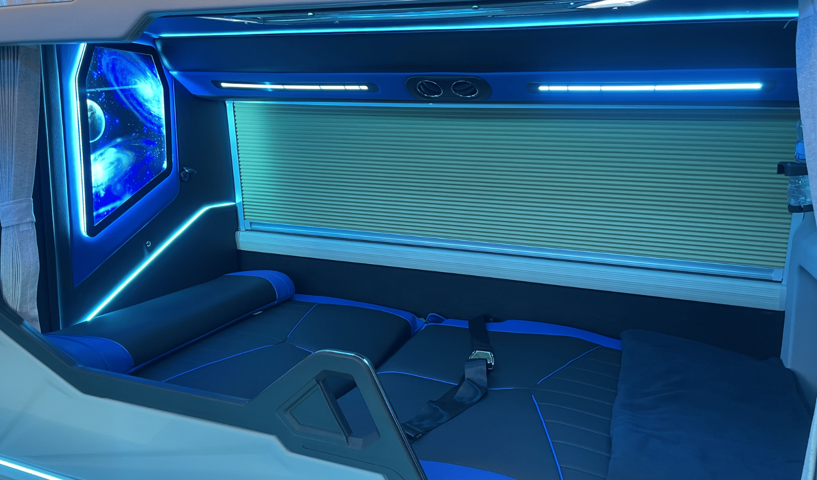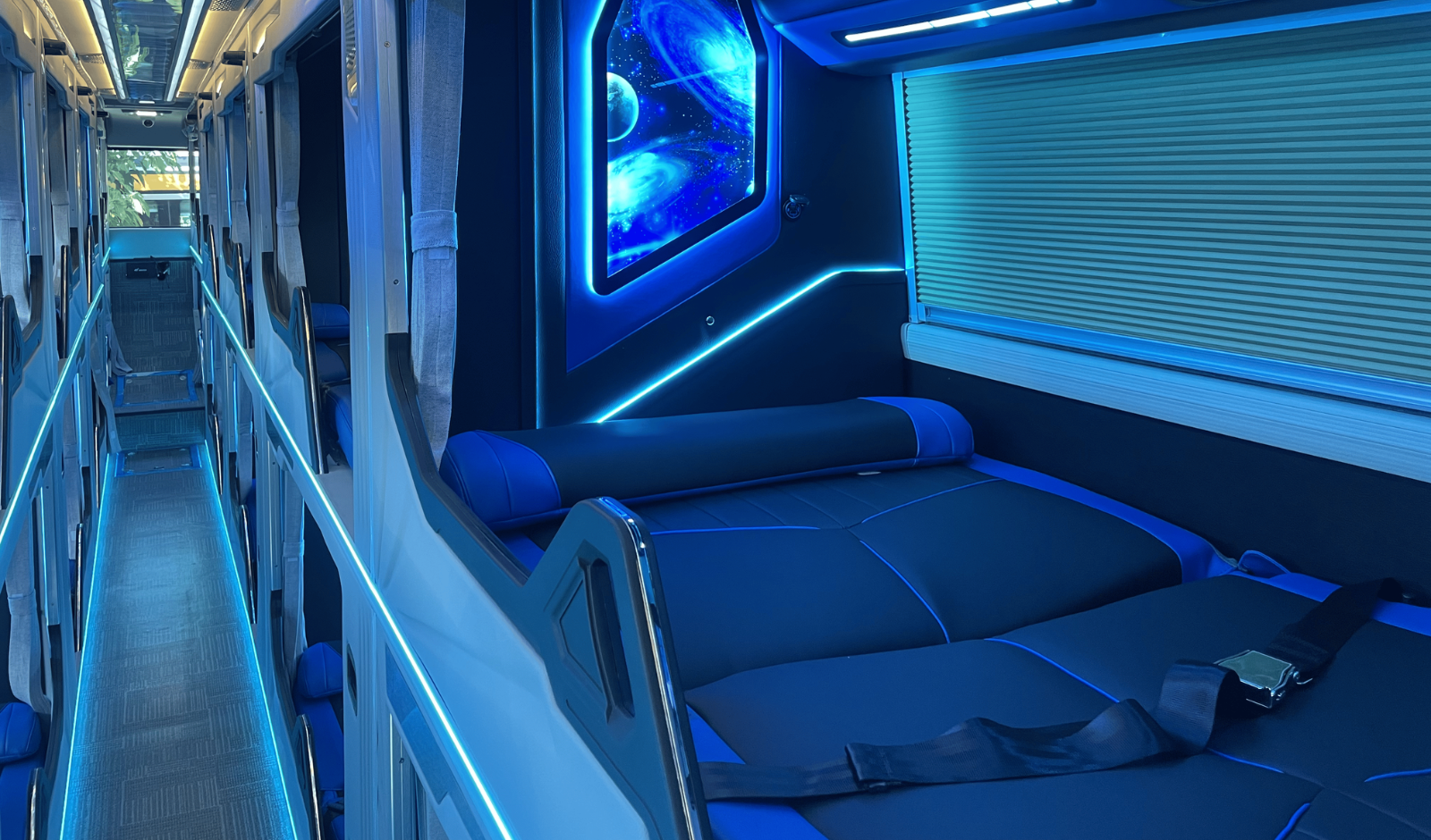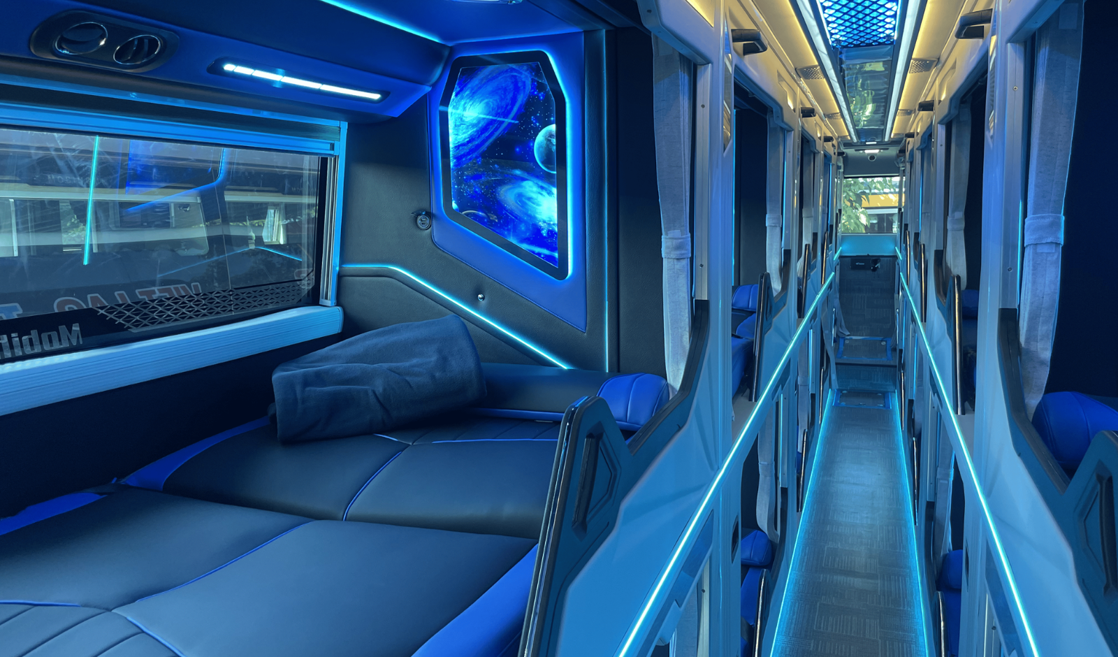 Vách cabin nổi bật với tranh vũ trụ độc đáo, kết hợp ánh sáng LED mang đến cảm giác sang trọng, hiện đại và khác biệt.
