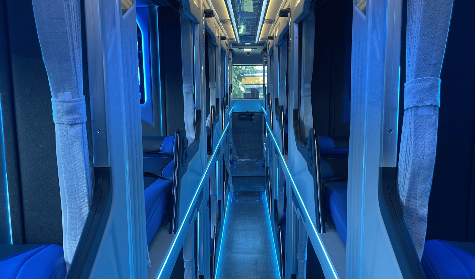 Trang bị giường bọc da cao cấp, không gian nằm rộng rãi, hệ thống đèn LED xanh dương tinh tế, cửa gió điều hòa riêng và rèm che ánh sáng tiện lợi.