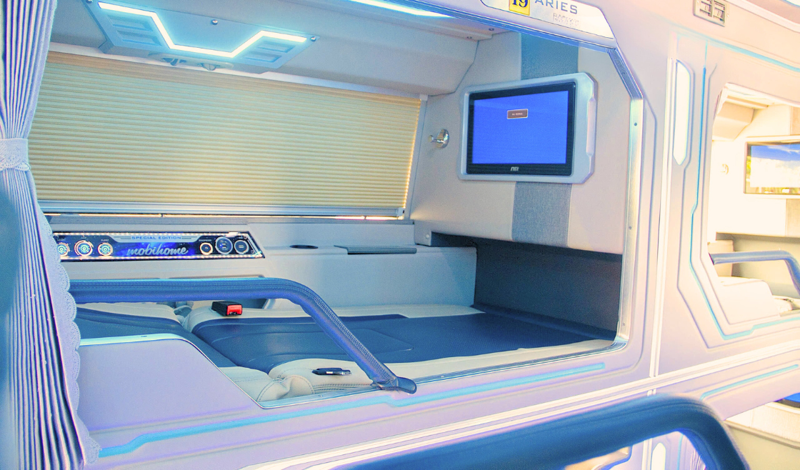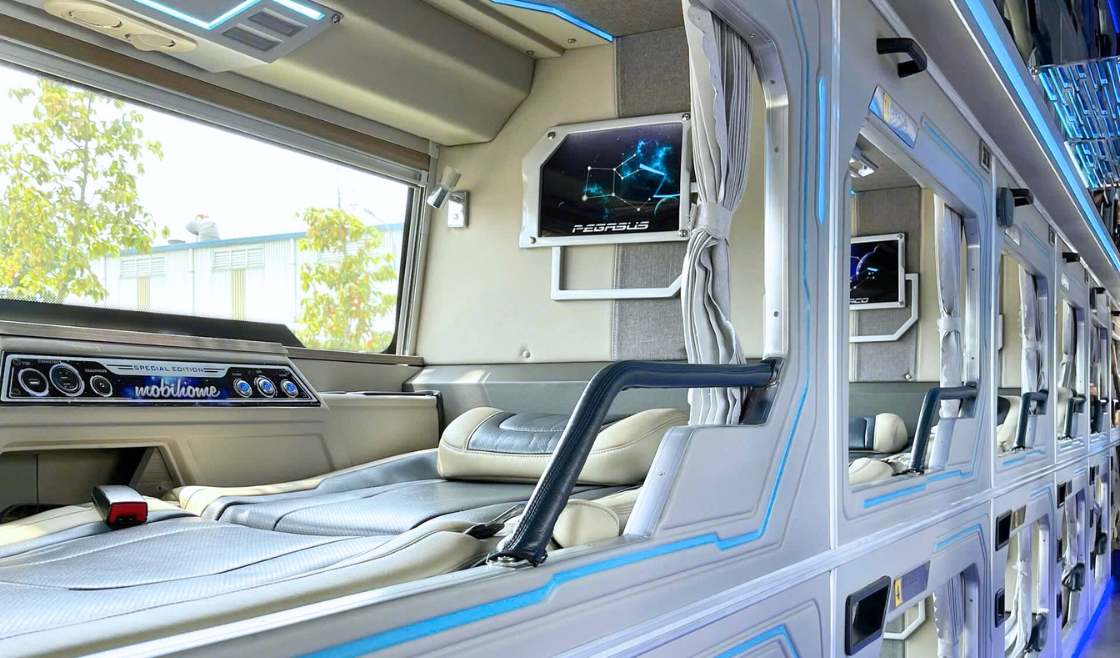 Cabin trang bị giường nằm rộng rãi, bọc da cao cấp, kèm theo màn hình giải trí, hệ thống đèn LED tinh tế, cổng sạc tiện lợi.
